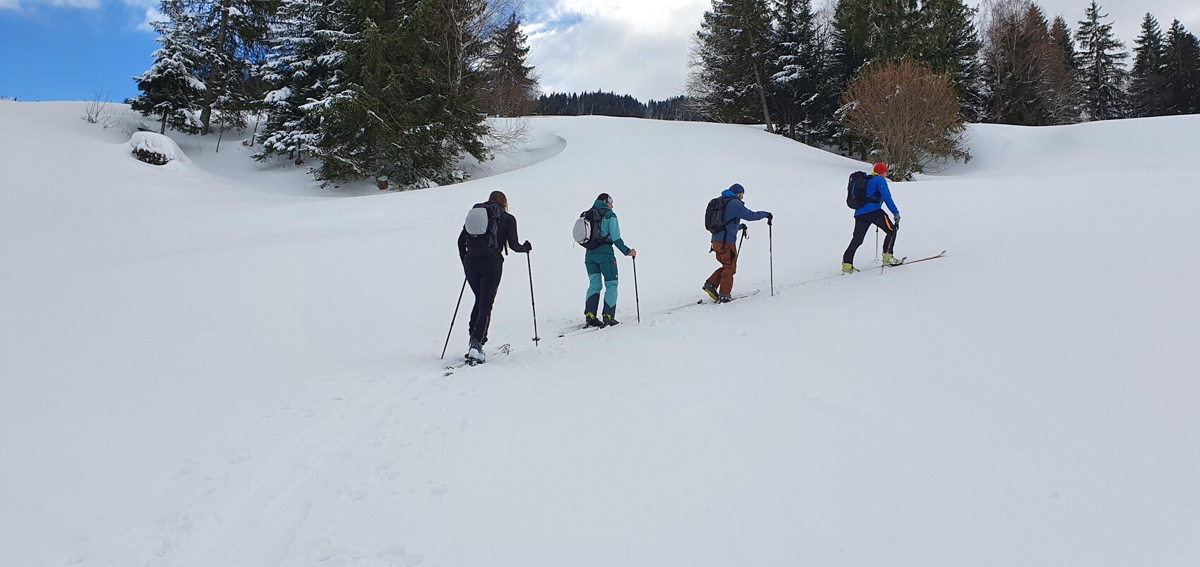 Sicherheitsausrüstung (Skitourenrucksack mit Erste-Hilfe-Set, Verschütteten-Suchgerät, Lawinen-Sonde und -Schaufel) wird bei Bedarf kostenlos zur Verfügung gestellt.