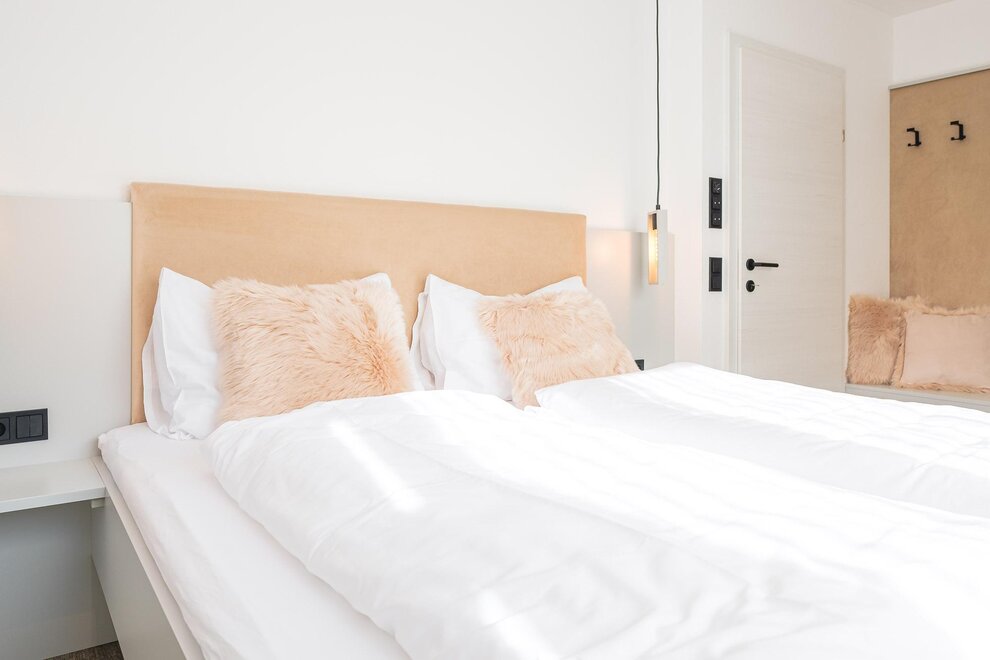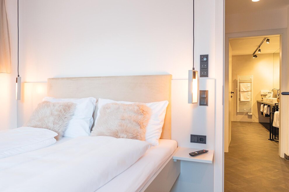 Das Nichtraucher-Apartment verfügt über 65 m² Wohnfläche, zwei Allergiker-Schlafzimmer mit Doppelbett, einem Wohnraum mit Speicherofen, Esstisch, Couchecke mit Ausziehcouch und einer top ausgestatteten Küchenzeile mit E-Herd, Backofen, Geschirrspüler und Kaffeemaschine und weiterem Zubehör. Flat-TVs mit Kabel-TV und Radio (Panorama-TV) befinden sich in den zwei Schlafzimmern und im Wohnraum. Das Badezimmer verfügt über eine (Regen)dusche, ein Doppelwaschbecken und ein WC mit Bidet. Ein extra WC ist zusätzlich vorhanden. Auf dem 30 m² großen Balkon (ostseitig) befindet sich die Private-Outdoor-Sauna verbunden zur Wiese (südseitig).