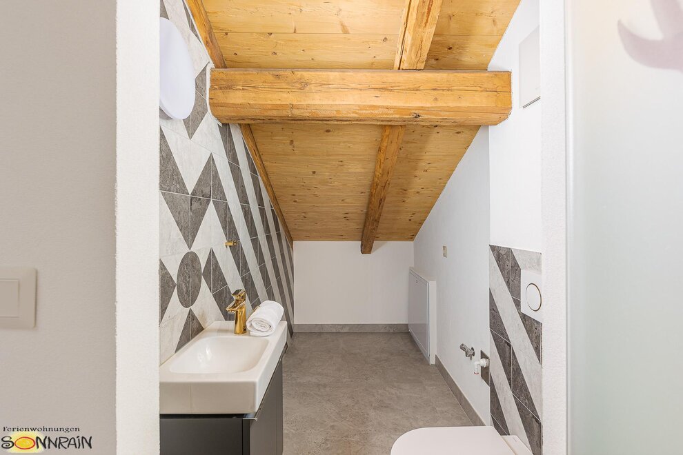Das Apartment hat auf dem ersten Stock ein Masterbedroom mit en Suite Badezimmer, zweites Schlafzimmer mit Balkonzugang, ein Badezimmer mit Dusche und WC, Küche, Balkon. Im Dachgeschoss sind weitere 2 Zimmer für bis zur 4 Personen, und eine WC mit Handwaschbecken, wo wir erwähnen müssen, dass aus Bautechnische Gründe die freie Höhe an einigen Stellen eingegrenzt ist. Sichtdachstuhl, Dachfenstern und eine Panorama Glasdach runden die Wohnung ab.