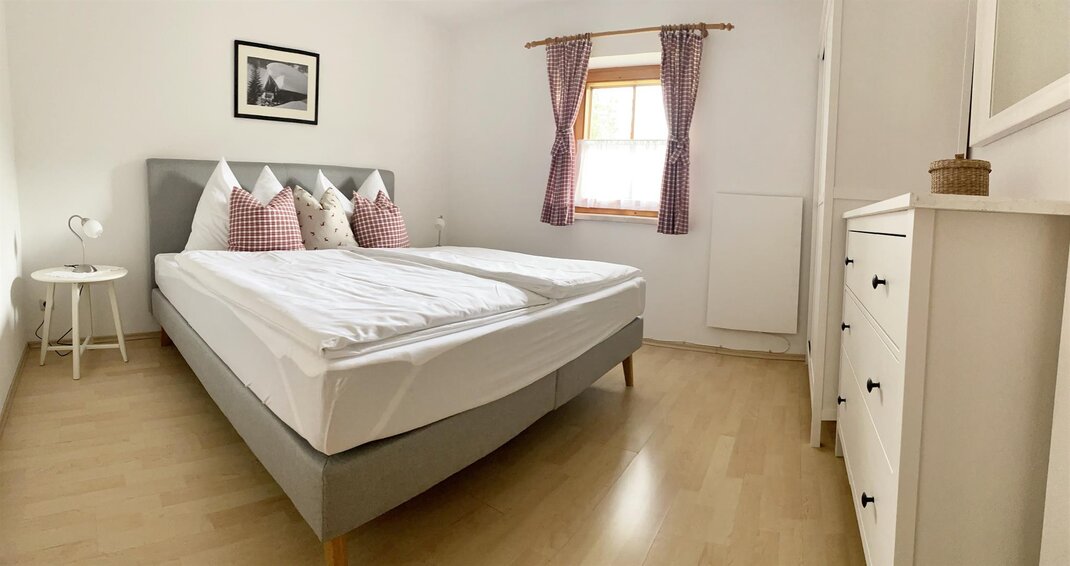 Zwei Schlafzimmer: Hauptschlafzimmer südseitig mit super komfortablen Boxspring Doppelbett, zweites Schlafzimmer mit Blick auf die Leoganger Steinberge und zwei Einzelbetten aus Vollholz mit Bio-Matratzen. Bad mit Dusche, getrenntes WC, kostenloses Wifi.