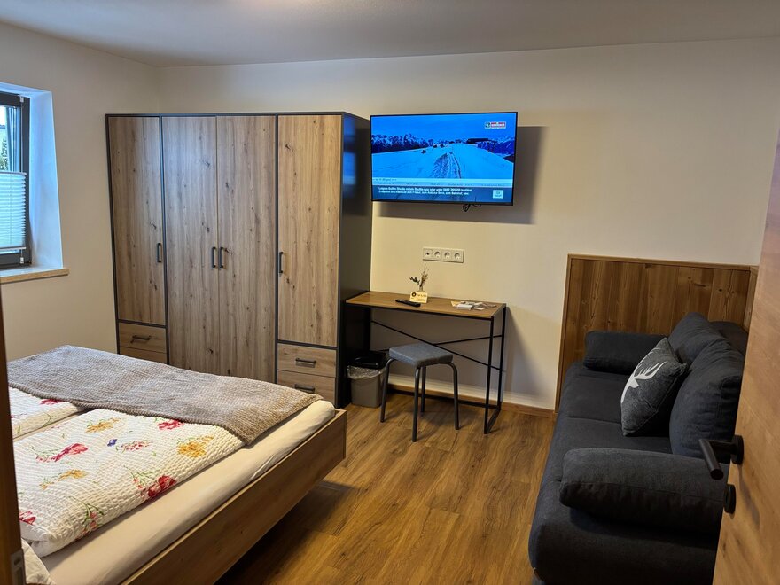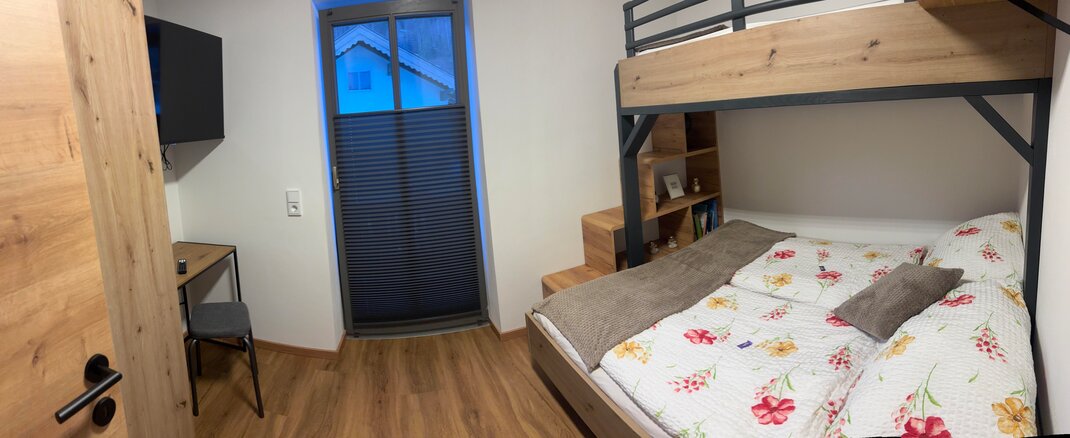 Ein Schlafzimmer verfügt über ein Doppelbett und einer Ausziehcouch, im zweiten Schlafzimmer sorgt ein Etagenbett, wo bis zu 3 Personen Platz finden, für erholsame Nächte.Ausstattung Zimmer/Appartement