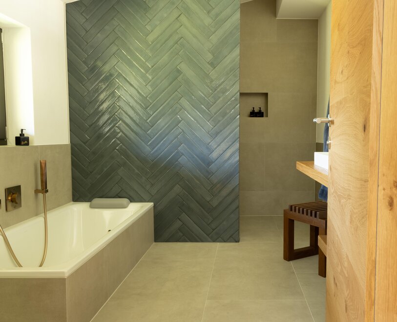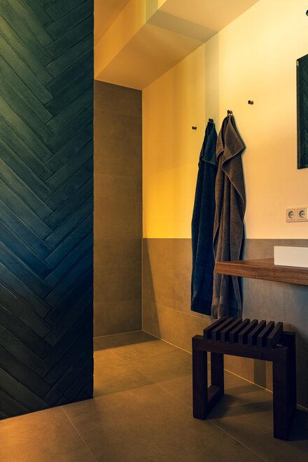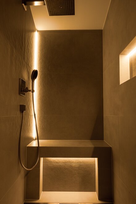 Im stilvollen Badezimmer erwarten dich eine hochwertige Badewanne, eine großzügige Regendusche sowie eine beheizte Sitzbank – perfekt, um nach einem Tag auf der Piste oder am Bike-Trail zu entspannen.
