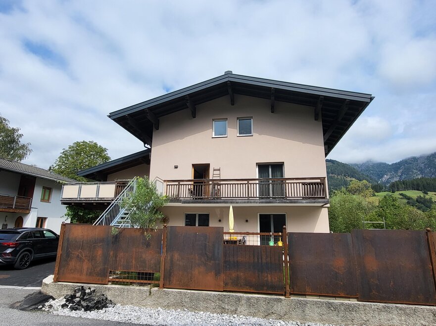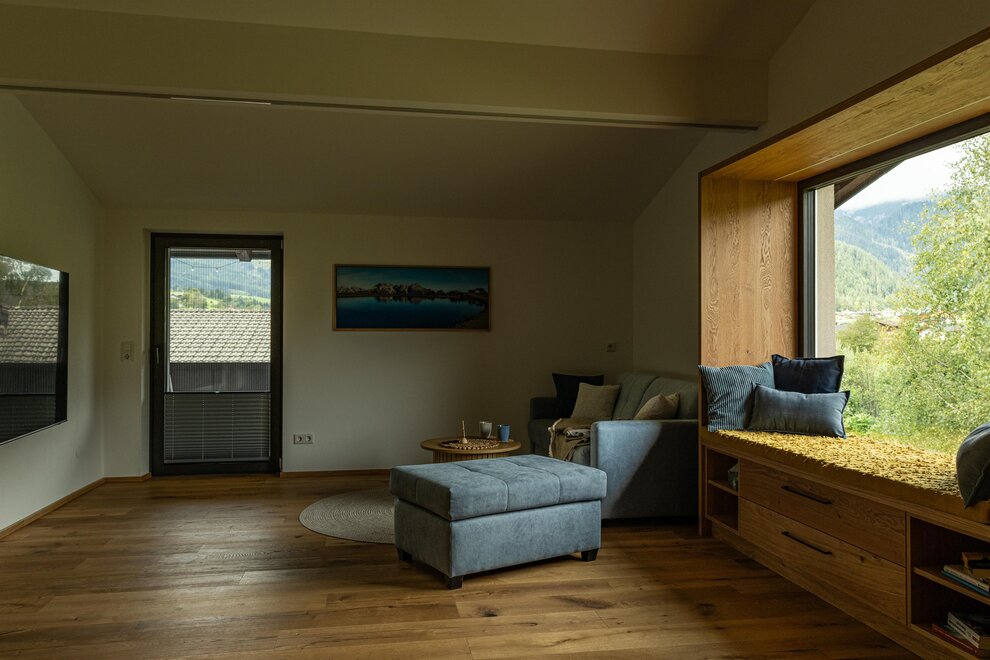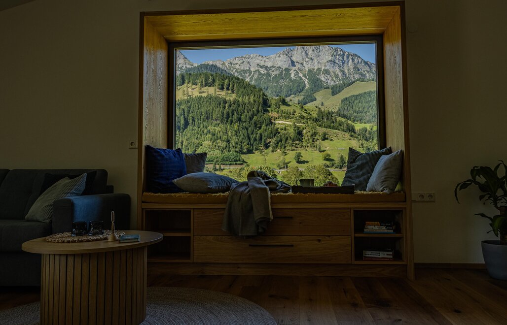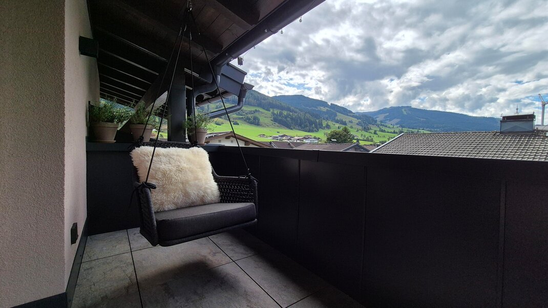 Die kleine, geschützte Dachterrasse lädt zum Durchatmen ein – mit direktem Blick auf den Fuchskopf und die umliegende Bergwelt. Ein Ort der Ruhe, den man so schnell nicht vergisst.