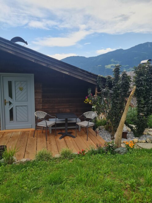Highlight ist die sonnige Terrasse mit Bergpanorama - ideal für Frühstück unter freiem Himmel oder ein Glas Wein beim Sonnenuntergang.
