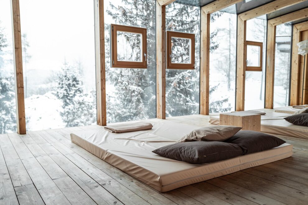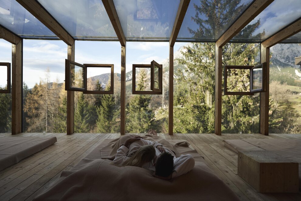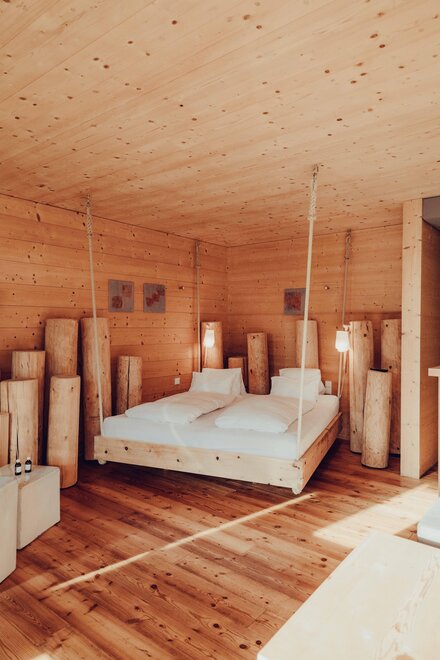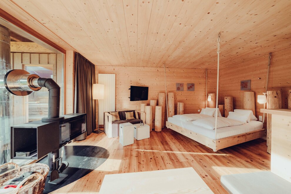 In der Secret Forest Suite schwebst du im Zirbenbett mit Waldblick und kannst deine Gedanken freilassen. Die Grenze zwischen drinnen und draußen verschwimmt und ist nur durch eine Panoramascheibe vorhanden.