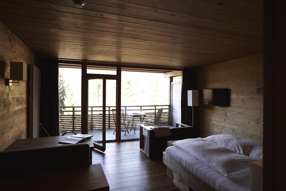 Umgeben von feinstem Zirbenholz kannst du im Hill View zwischen Tag und Nacht deinen eigenen Rhythmus finden. Die klare und erdende Atmosphäre wird durch den sanften Duft der Zirbe und dem atemberaubenden Blick in die Natur geschaffen. Nur eine große Fensterfront trennt Zimmer von Balkon mit bester Aussicht und dich von der Natur.