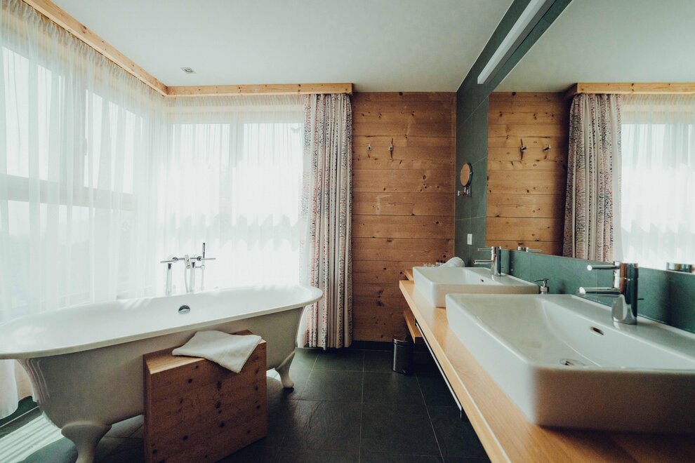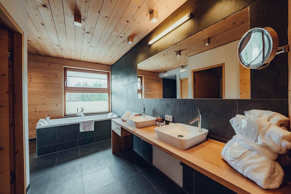 Die frei stehende Wanne vor dem Eckfenster mit Blick über Leogang und auf die Berge ist sicher das Highlight der Sunny Suite. Auf etwa 50m² bist du mit der Natur verbunden und erlebst unvergessliche Stunden. Du bist umgeben von angenehmem Holzduft oder liegst in einem Aromabad in der Wanne und lässt die Zeit verstreichen.