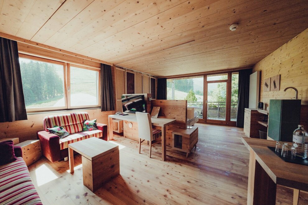 Aus jedem Fenster hast du einen umwerfenden Blick in die Berge und in die Natur. Der Blick verleiht dem Zimmer eine schöne Stimmung und wird verstärkt durch den sanften Duft des Zirbenholzes.