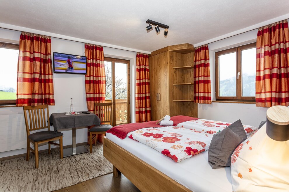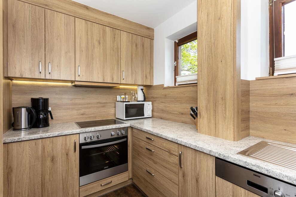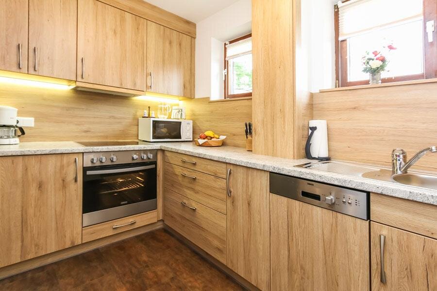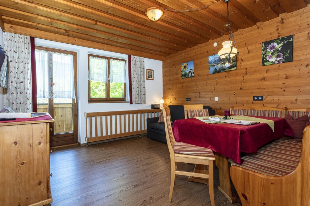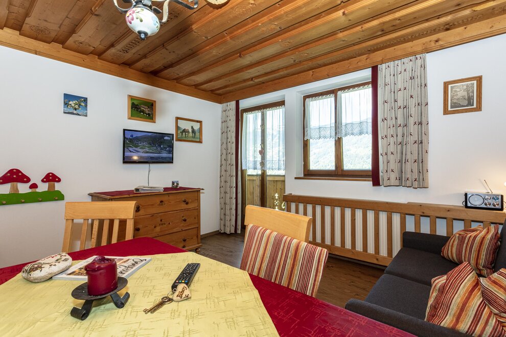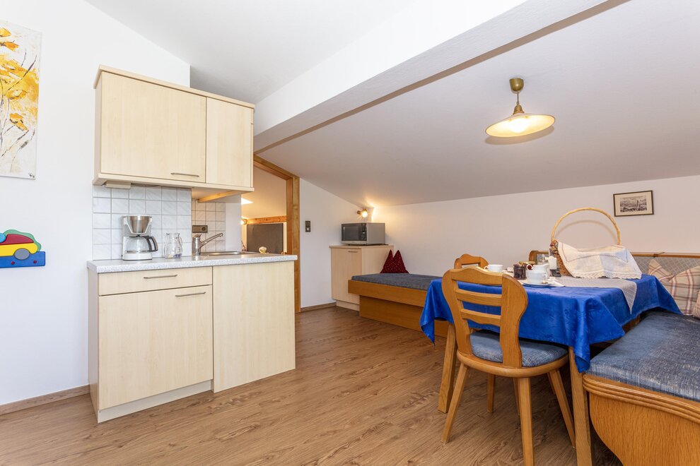 4 - 5 Personen (50 m2): Elternschlafzimmer mit Doppelbett (Zirbenholzzimmer), Kinderzimmer mit 2 Einzelbetten ( Fußende bei allen Betten offen ), Dusche/WC, grosse Wohnküche mit Schlafcouch (5. Person), Eckbank mit grossem Tisch, Küchenblock mit 2 Kochplatten, Mikrowelle mit Backrohrfunktion, Kaffeemaschine, Kühlschrank, Wasserkocher, Geschirrspülmaschine in der Küche, Kabel-TV, Radio, abgeschlossenen Balkon im Dachgeschoß.