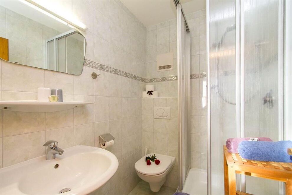 2 - 5 Personen (60 m2): 1 Dreibettzimmer mit Balkon und Dusche/WC, 1 Doppelzimmer mit Dusche/WC, Balkon, Radio und Kabel-TV, 1 großes Wohnzimmer mit Balkon, Kabel-TV, Radio, Couch, großem (ausziehbarem) Tisch mit Eckbank und großer Balkon. Wohnküche vollausgestattet mit Ceranfeld und Backofen, Kühlschrank, Mikrowelle, Kaffeemaschine, Wasserkocher, Geschirrspülmaschine im 1. Stock unseres Hauses.