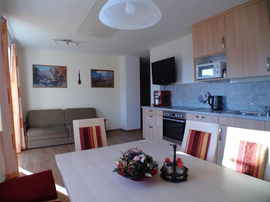 Ferienwohnung, gemütlich eingerichtete Wohnküche TV und WIFI, 1 Schlafzimmer, 1 Bad mit Dusche und separates WC