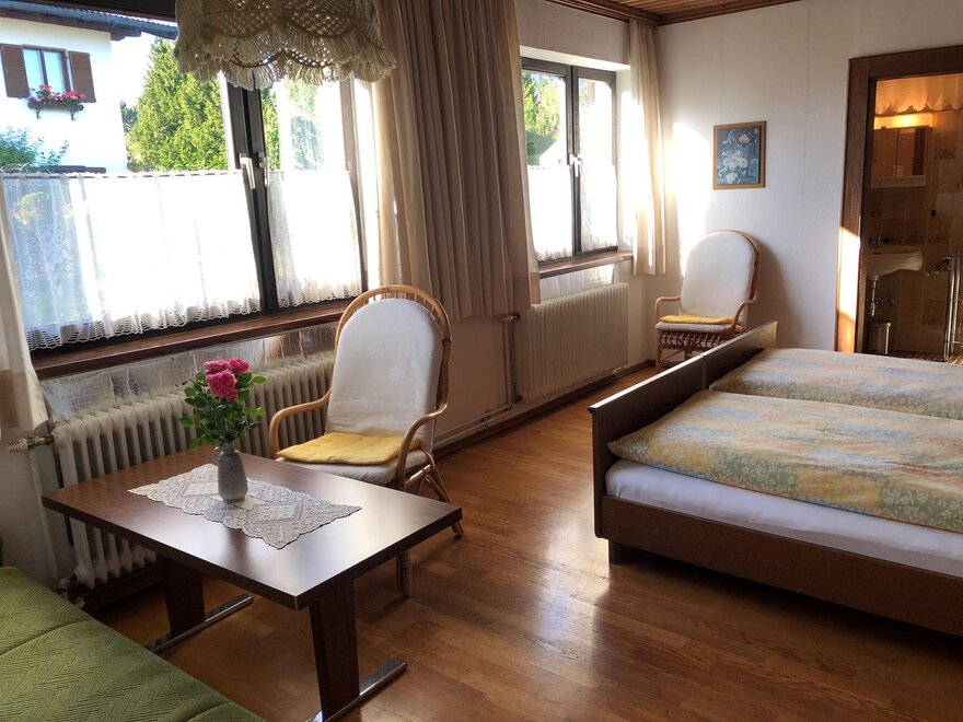 1 Appartement für 4 - 6 Personen mit Wohnküche, 2 Schlafzimmern, 2 DU/WC, WLAN;1 Appartement für 6 Personen mit Wohnzimmer, Kachelofen, Kochnische, 3 Schlafzimmern - jeweils mit Waschgelegenheit, DU/2xWC, WLAN, großer Balkon mit Terrasse, Garten. Gemütliche Wohnungen, ruhige, sonnige Lage, Nähe Zentrum, 2 Zimmer, DU/WC mit Frühstück.