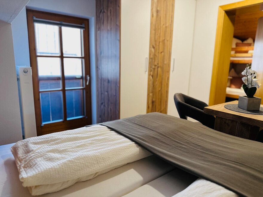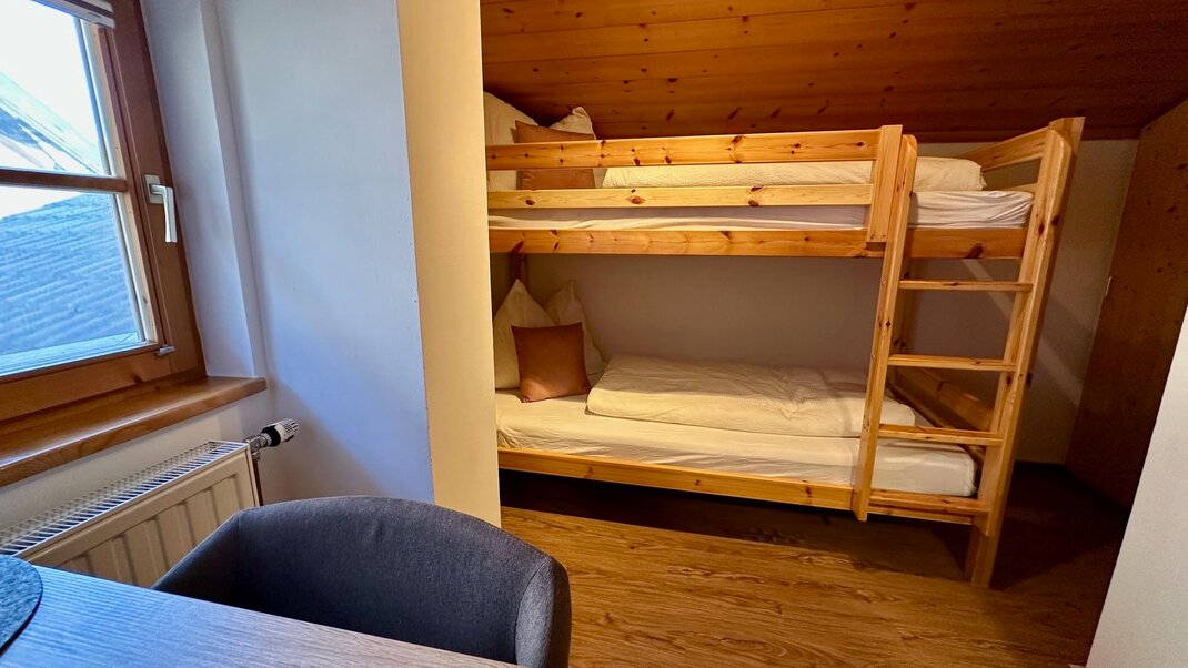 Das Schlafzimmer besteht aus einem goßen Doppelbett. Mit einer Durchgangstüre kommt man in das zweite Zimmer, wo sich ein Etagenbett für 2 Personen befindet. In der Wohnküche befindet sich das Schlafsofa, welches als zusätzliches Bett angeboten werden kann. Gerne stellen wir Ihnen auf Anfrage auch ein Gitterbett zur Verfügung.