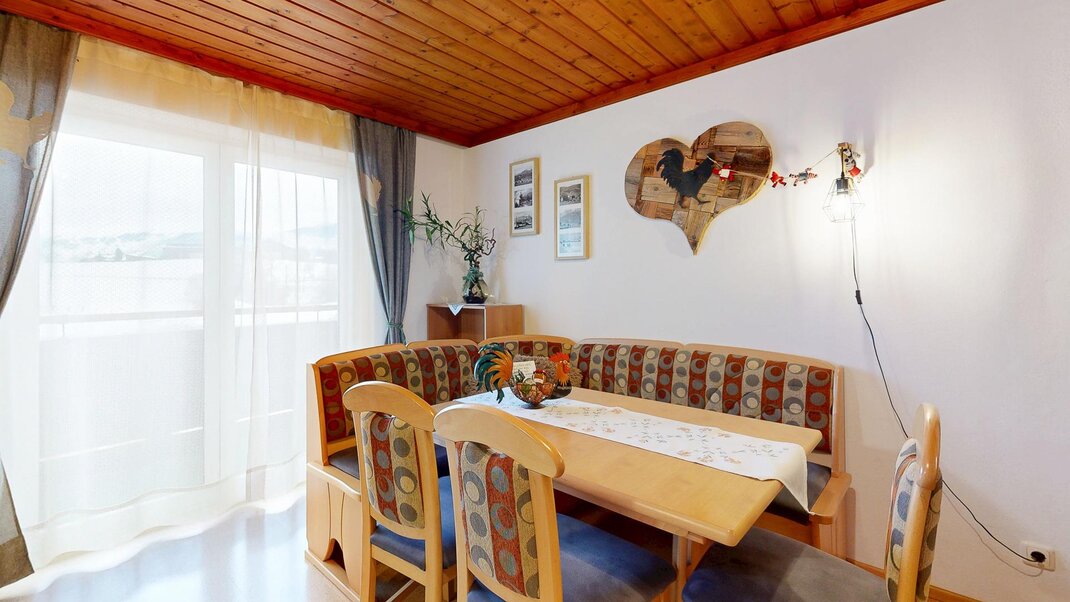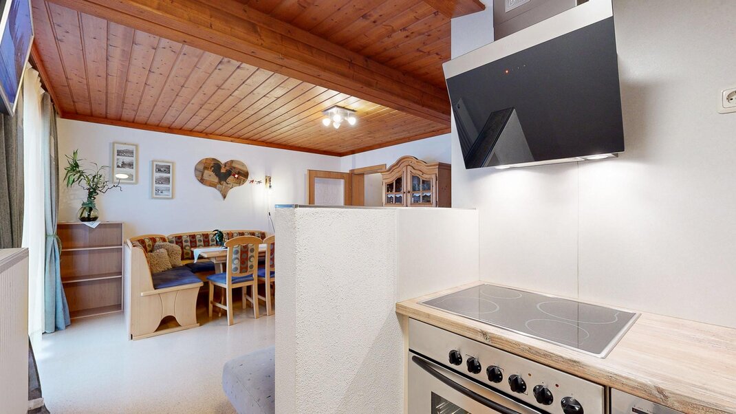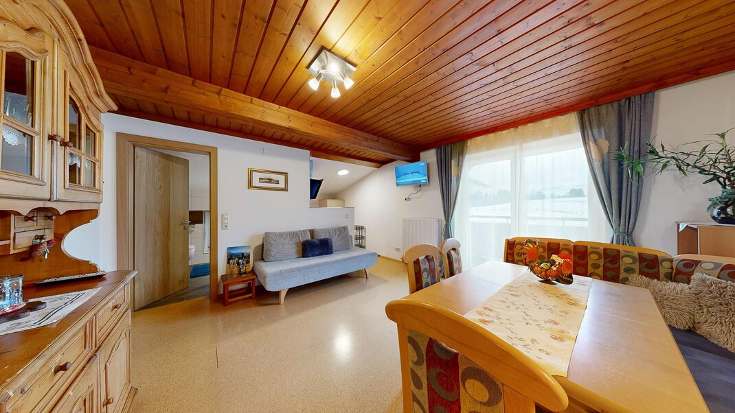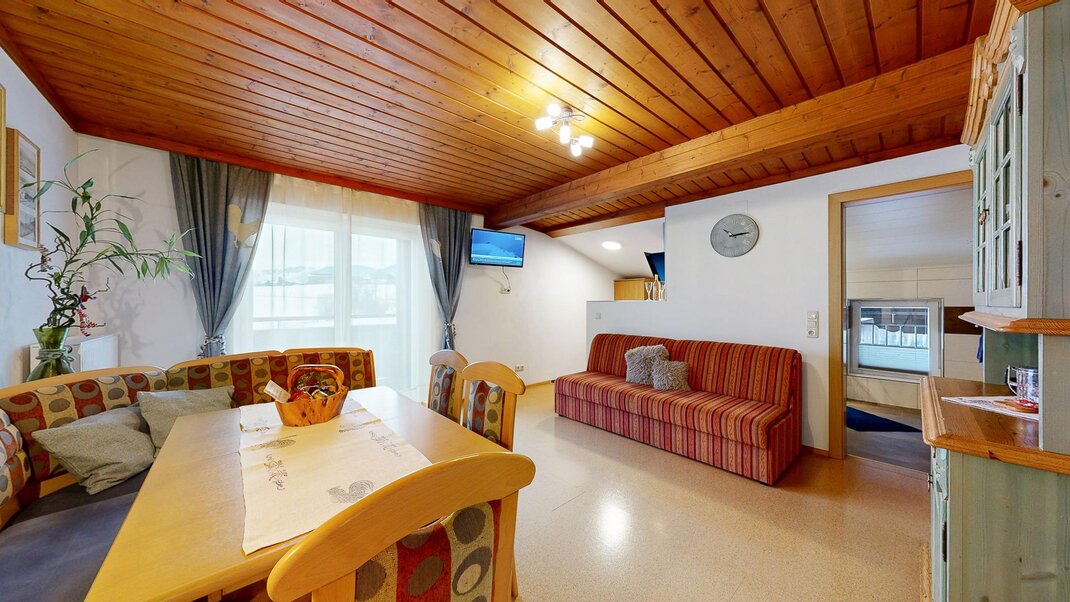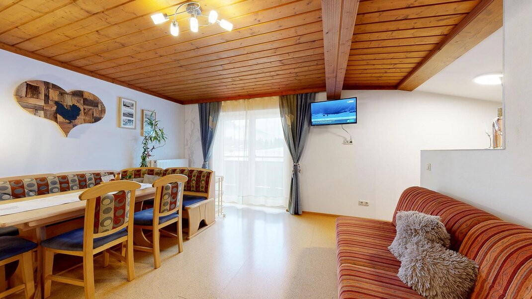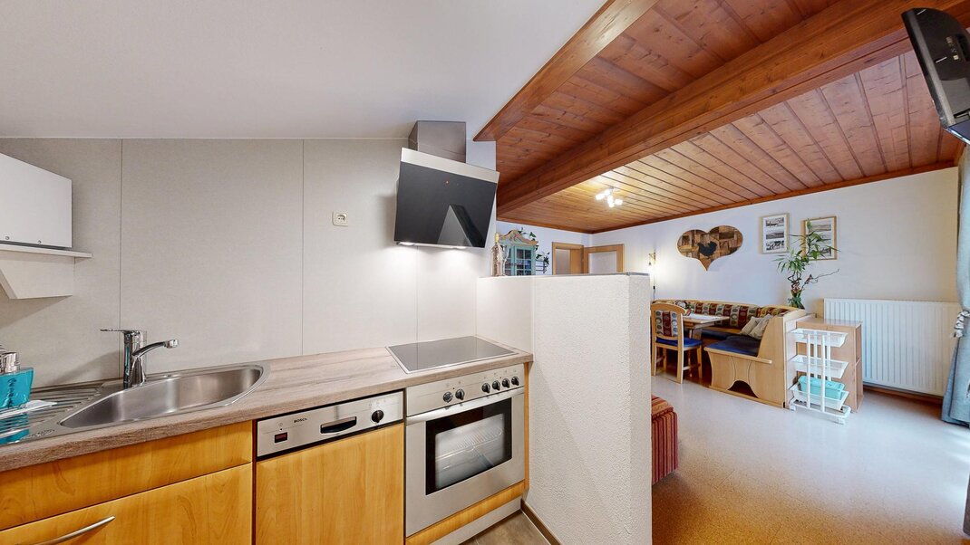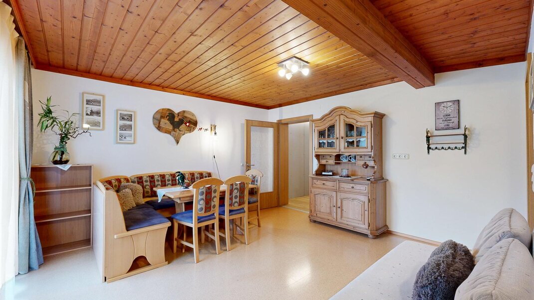 Sie besteht aus Vorraum, einem Doppelzimmer und einem Dreibettzimmer Dusche, extra Wc ,einer voll ausgestatteten Wohnküche ( Backrohr, Geschirrspüler, Micro....) mit großer Eckbank , mit ausziehbarer Schlafcouch und Balkon .WLAN gratis und Elektrischer Bekleidungs und Schuhtrockenanlage im Keller