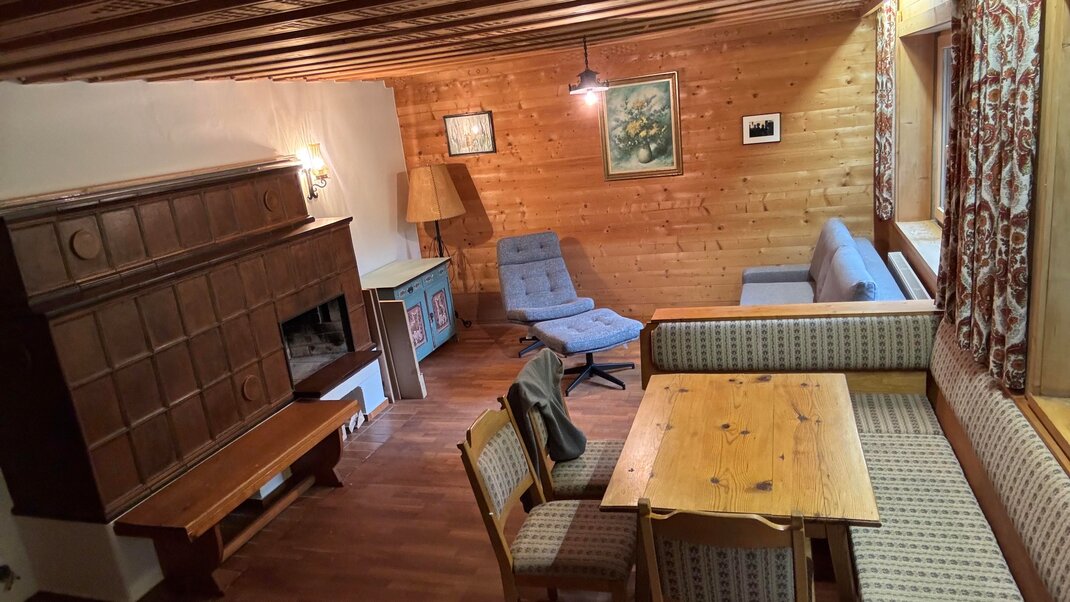 SZ 1: Ein Doppelbett (180 cm), SZ 2: Ein Doppelbett (180 cm) od 2 Einzelbetten. Wohnzimmer mit Kachelofen und Ofenbank, offener Kamin, TV, Esstisch, Sitzecke. Bad mit geräumiger Dusche, Badheizkörper zum Trocknen der Handtücher. Küche mit E-Herd, Kaffeemaschine, Geschirrspüler & Kühlschrank