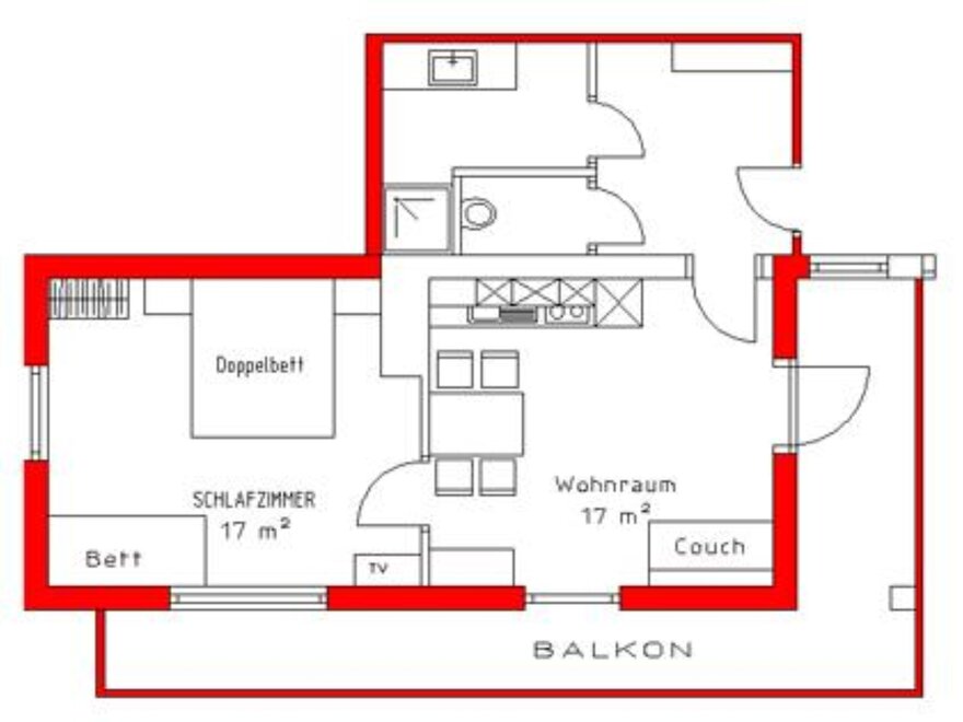 A completed apartment (non smoking-apartment, floor heating), about 82 m², for 4 - 6 people. Consisting of 2 double rooms with cable TV, a beautiful living room (using as two comfortable single-beds possible) with radio and cable TV, 1 bathroom with shower und extra toilet , a 2nd bathroom with shower and toilet.