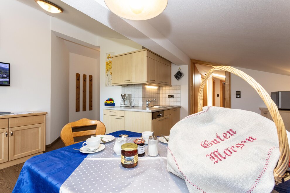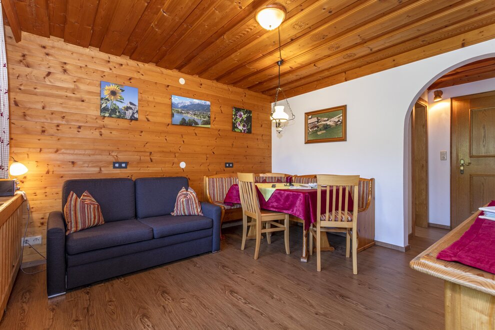 4-5 persons (50 sqm): 1 parents bedroom, 1 children's room with 2 single beds (open bottom part of the beds), shower/WC, large kitchen living with sofa-sleeper (5th person), corner seat with large table, kitchen with 2 hot places, microwave, coffee machine, fridge, water boiler, cable TV, radio, locked balcony on the top floor, towels available! Fantastic view to the mount of Schwalbenwand.