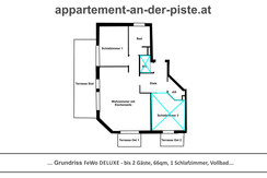 You will use the appartement-an-der-piste.at, which will be reduced by one bedroom according to the attached floor plan. Four of you live in a 35 sqm room with fireplace and open kitchen. The WC's are close to the bedrooms. 3 terraces in your own 170 sqm garden round off this flat type comfortably.